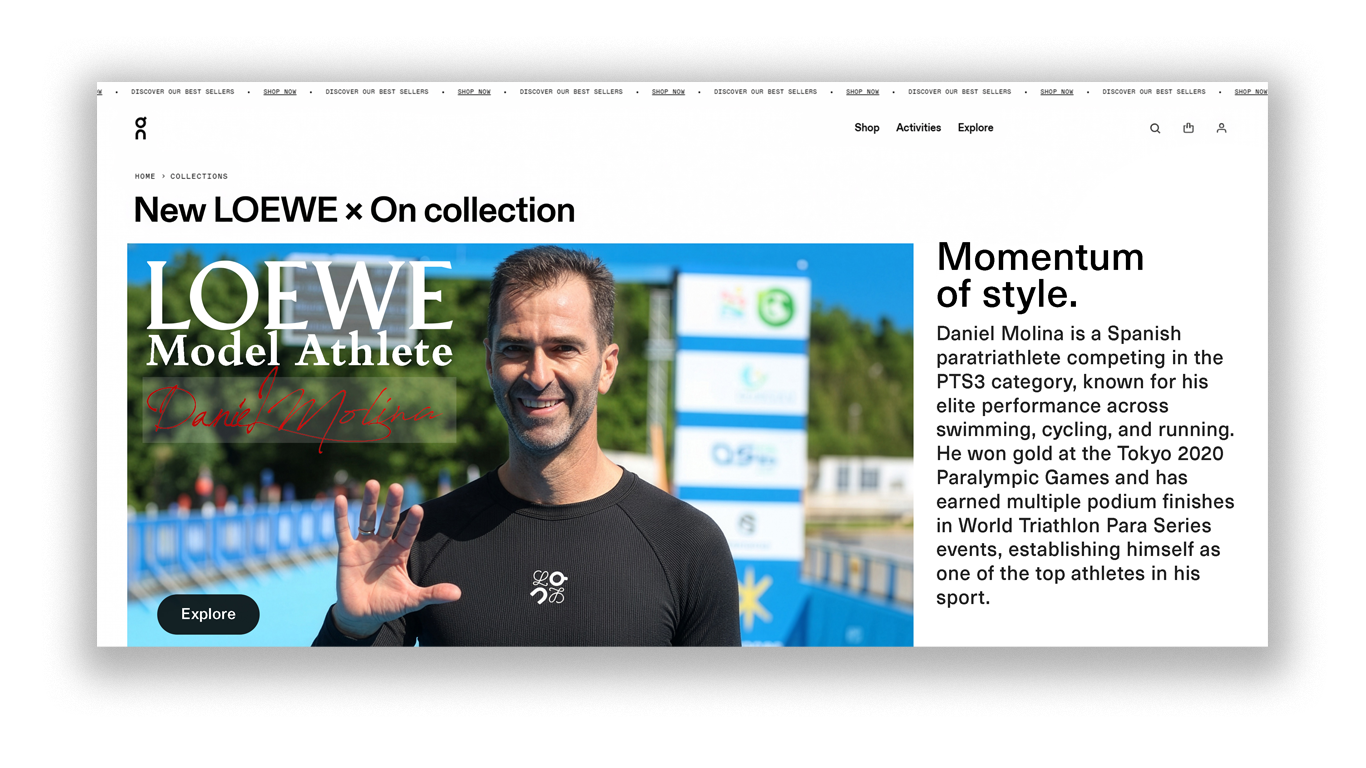 Daniel Molina appears across the Loewe x On social platforms, offering a glimpse into his day-to-day life as a Paralympic athlete.